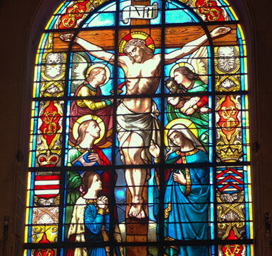 With this money, the parish priest of Our Lady of Victories commissions the stained glass window you see. The weeping woman beside the cross is the duchess. At her side, you see the guardian angel of the child who is taking his soul to Heaven.