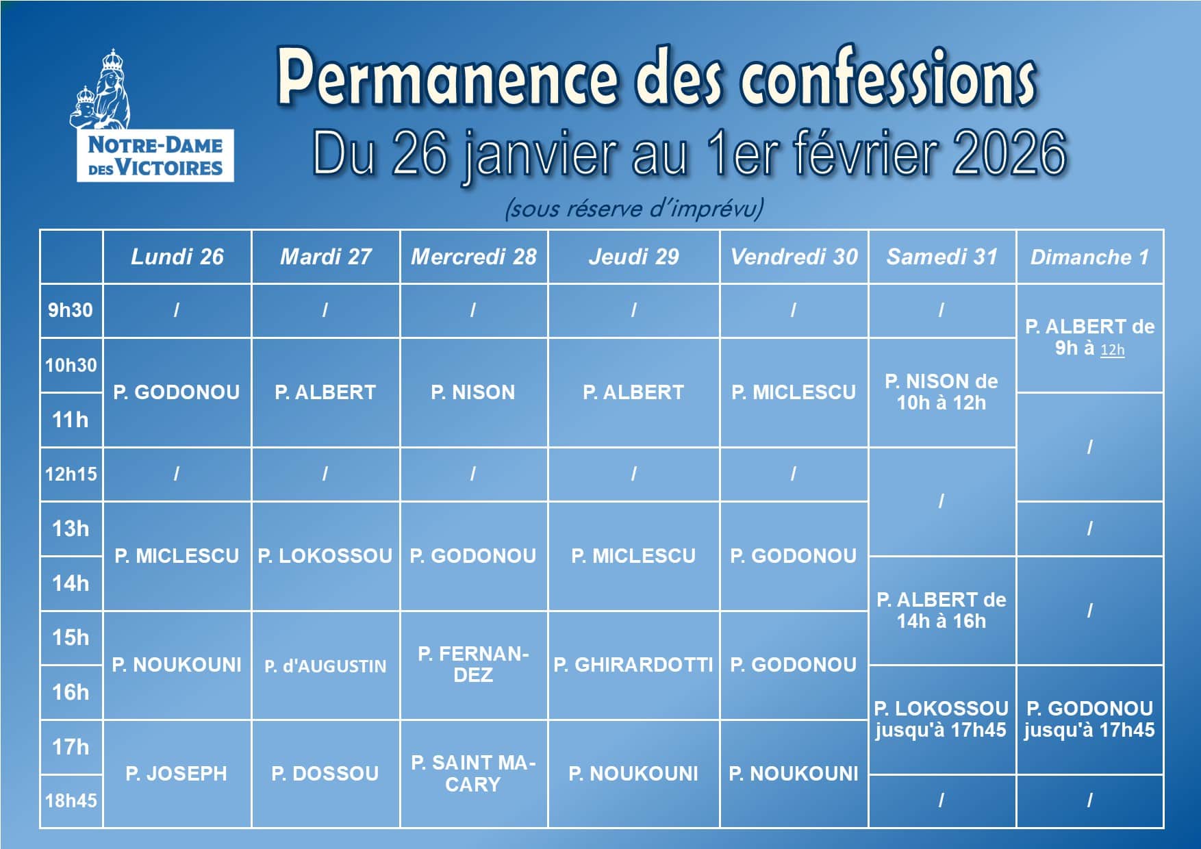 - Jeudi : 12h15 et 19h + 14h30 (retransmise sur Radio Notre-Dame 100.7)