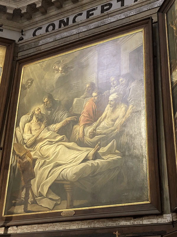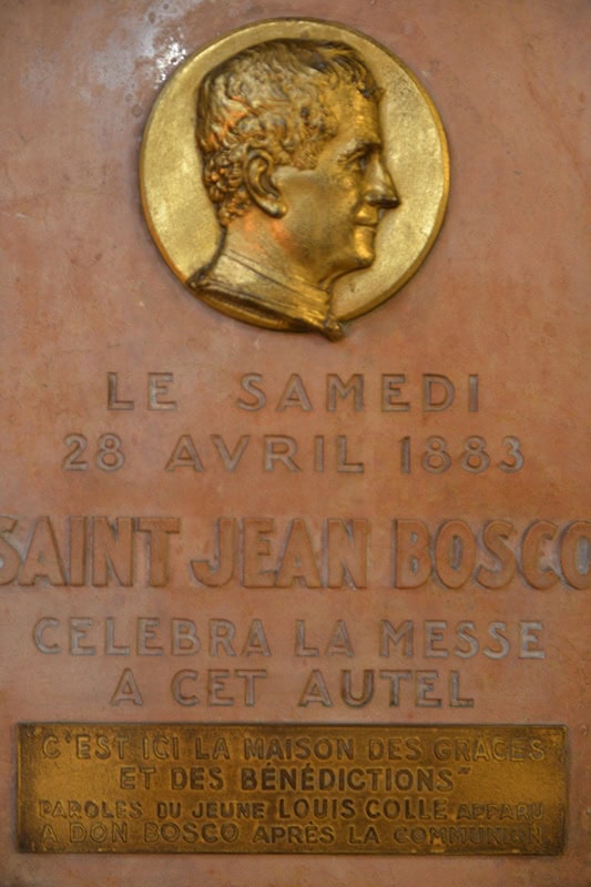 Sur le mur à droite de l’autel, un ex-voto met à l’honneur la visite de saint Jean Bosco en 1883.