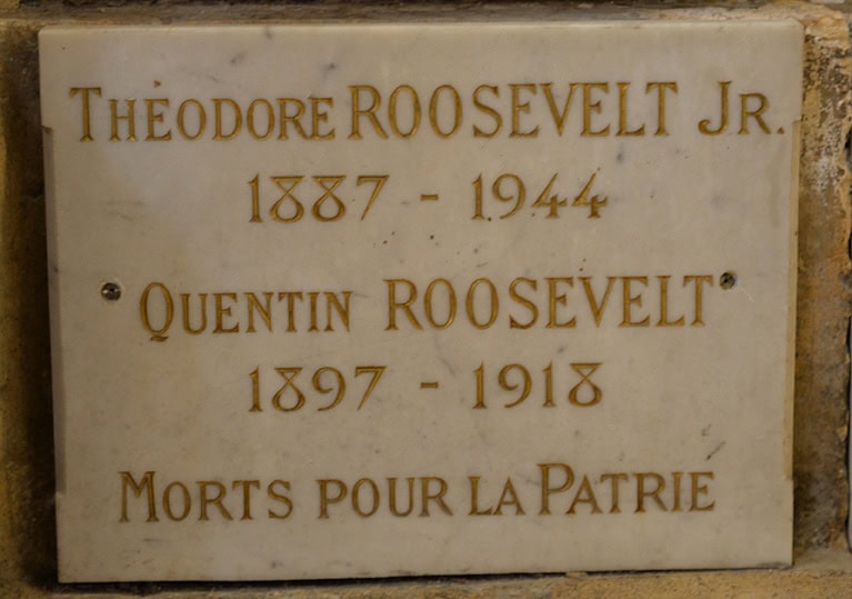 Sur le même mur, se trouve un ex-voto américain de la famille Roosevelt en mémoire de Quentin Roosevelt, fils du président Theodore Roosevelt, tombé au champ d’honneur en France en 1918 et Francklin Rooselvert Jr qui participa au Débarquement en 1944.