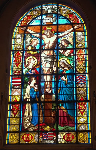 Avec cet argent, le curé de Notre-Dame des Victoires commande le vitrail que vous voyez. La femme en pleurs auprès de la croix est la duchesse. À ses côtés, vous apercevez l’ange gardien de l’enfant qui emporte son âme au Paradis.