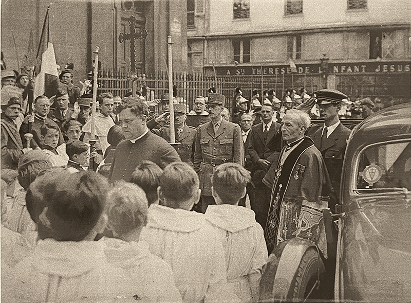 Le général Charles De Gaulle, arrivant à Notre-Dame des Victoires le 1er septembre 1944 pour une messe d’action de grâce. À ses côtés, on reconnaît les généraux Pierre Koenig (derrière le cierge) et Jacques Chaban-Delmas ainsi que le père Léopold Bruckberger, célèbre dominicain et résistant.